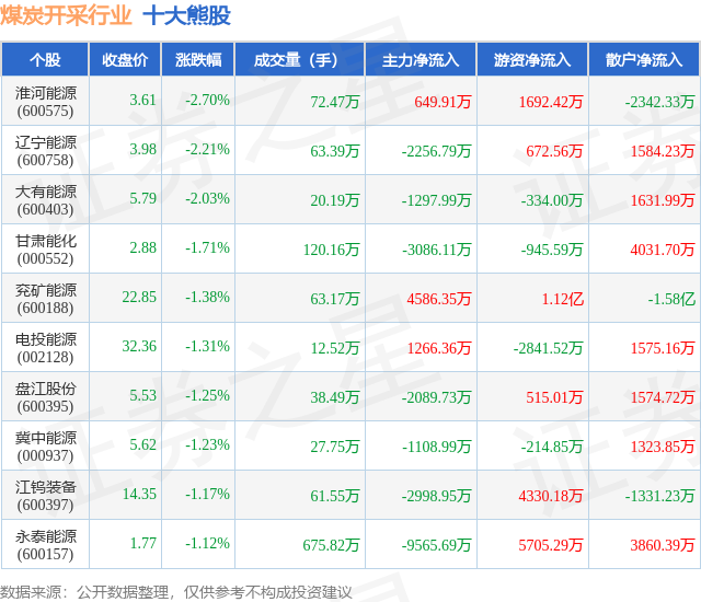 个股表现方面,煤炭开采行业当日领跌股为淮河能源(600575),该股当日报收3.61,下跌2.7%,成交量72.47万,主力资金净流入649.91万元。辽宁能源(600758)以下跌2.21%紧随其后,该股当日成交量63.39万,主力资金净流出2256.79万元。除此之外,大有能源(600403)、甘肃能化(000552)、兖矿能源(600188)均进入当日熊股之列。具体个股列表见下表:
