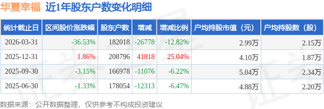 证券之星消息,近日华夏幸福披露,截至2026年3月31日公司股东户数为18.2万户,较12月31日减少2.68万户,减幅为12.82%。户均持股数量由上期的1.87万股增加至2.15万股,户均持股市值为2.99万元。