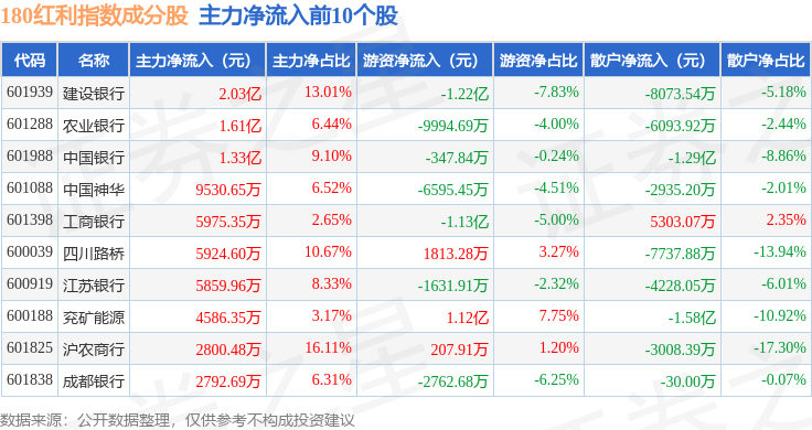 资金流向方面,180红利(000149)指数成份股当日主力资金净流出合计6.28亿元,游资资金净流出合计1.09亿元,散户资金净流入合计7.37亿元。成份股资金流向详情见下表:
