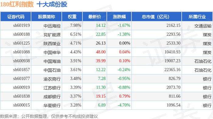 证券之星消息,4月30日,180红利(000149)指数报收于4187.39点,跌0.89%,成交424.84亿元,换手率0.26%。当日该指数成份股中,上涨的有8家,建设银行以1.43%的涨幅领涨,下跌的有20家,四川路桥以6.29%的跌幅领跌。