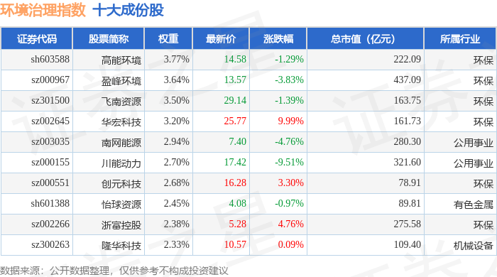 环境治理(399806)指数十大成份股详情如下:
