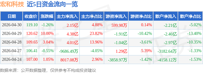 证券之星消息,截至2026年4月30日收盘,宏和科技(603256)报收于119.1元,下跌1.26%,换手率4.26%,成交量37.5万手,成交额44.06亿元。