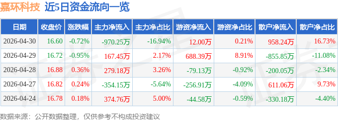 证券之星消息,截至2026年4月30日收盘,嘉环科技(603206)报收于16.6元,下跌0.72%,换手率1.13%,成交量3.44万手,成交额5726.82万元。