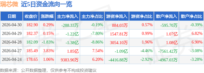 证券之星消息,截至2026年4月30日收盘,瑞芯微(603893)报收于182.9元,上涨0.29%,换手率2.0%,成交量8.42万手,成交额15.39亿元。