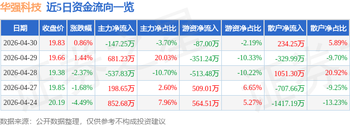 证券之星消息,截至2026年4月30日收盘,华强科技(688151)报收于19.83元,上涨0.86%,换手率0.58%,成交量2.01万手,成交额3974.48万元。