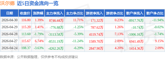 证券之星消息,截至2026年4月30日收盘,沃尔德(688028)报收于116.8元,上涨1.39%,换手率4.3%,成交量6.49万手,成交额7.47亿元。