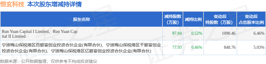 证券之星消息,4月30日恒玄科技发布公告《恒玄科技:关于股东减持股份结果公告》,其股东Run Yuan Capital I Limited、Run Yuan Capital II Limited、宁波梅山保税港区百碧富创业投资合伙企业(有限合伙)、宁波梅山保税港区千碧富创业投资合伙企业(有限合伙)、宁波梅山保税港区亿碧富创业投资合伙企业(有限合伙)于2026年4月11日至2026年4月29日间合计减持165.76万股,占公司目前总股本的0.9826%,变动期间该股股价上涨3.13%,截止4月29日收盘报173.25元。