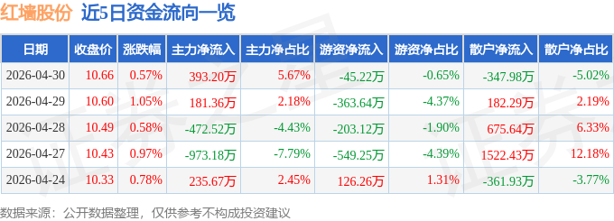 证券之星消息,截至2026年4月30日收盘,红墙股份(002809)报收于10.66元,上涨0.57%,换手率3.84%,成交量6.52万手,成交额6936.76万元。