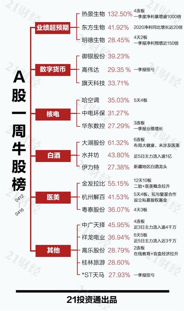 纵观20大牛股,除业绩超预期外,市场热点轮动、题材概念牛股频现,数字货币、核电、白酒、医美等板块当周强势发力。其中,金发拉比(002762.SZ)涉及医美和二胎双概念,12个交易日10次触板,累计上涨164.24%。4月16日,深交所公告称将对金发拉比持续进行重点监控。