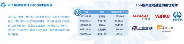 新财富表示,Top50公司也是ESG相关主题基金的重仓对象。2023年一季度,共计395只股票被201只ESG相关主题基金重仓,有21家Top50公司位列其中,而10家“最佳ESG实践奖”公司中有8家,这些公司覆盖了风电、动力电池、绿色建筑等碳中和热门赛道,同时不乏“中特估”“AI+”等备受市场追捧的主题概念。回溯上市至2023年3月底的股价涨幅情况,“最佳ESG实践奖”公司上市后股价平均上涨了277.71倍,而本届Top50公司平均上涨79.61倍,A股公司平均上涨9.31倍,可见,获奖公司对市场更具正向回报。