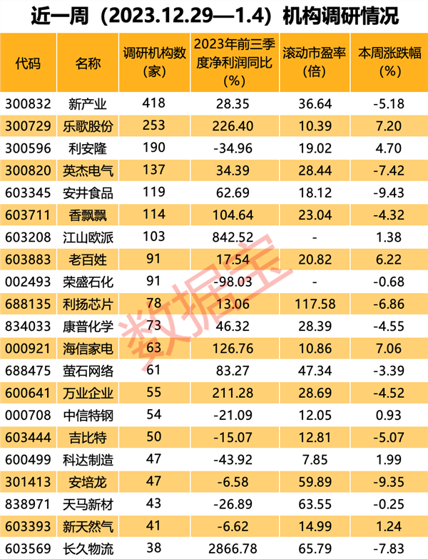 近一周机构调研个股数量有140多只,新产业成为调研机构数量最多的股票。