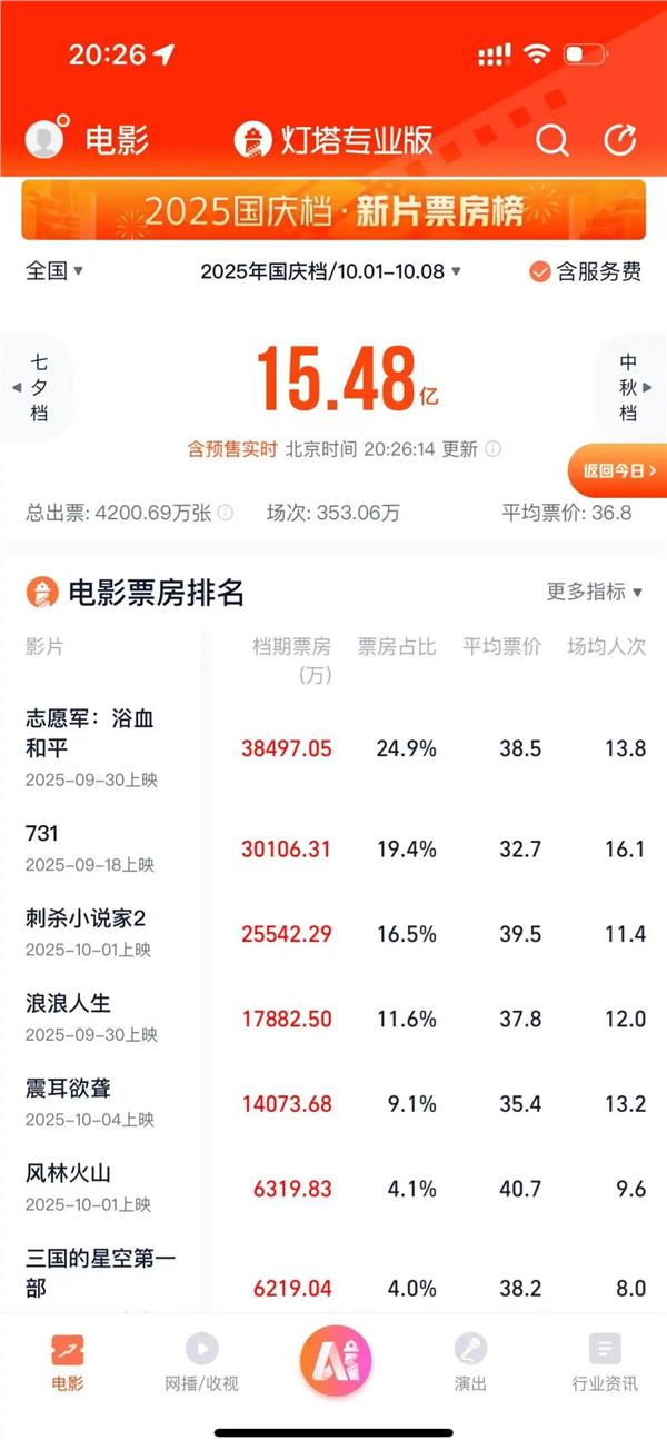 今年国庆档影片在类型丰富度和整体品质上保持多元化的特点,奇幻、动作、战争、剧情、动画、喜剧、犯罪等多种类型影片同台竞技。既有高规格、高工业化的大片《刺杀小说家2》,又有主流商业大片《志愿军:浴血和平》,还有喜剧影片《浪浪人生》等,可满足不同受众的观影需求。业内人士分析,今年国庆档为期8天,较往年多出1天,有望通过长尾效应走出令人满意的票房曲线。
