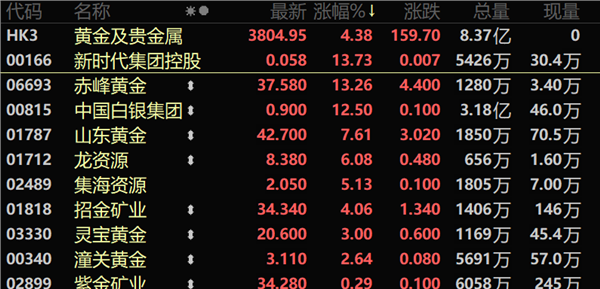 受金价上涨影响,国庆中秋长假期间港股有色金属个股跟涨,赤峰黄金港股10月8日大涨13.26%,股价创上市以来新高,假期期间累计上涨23.54%;中国白银集团10月8日上涨12.5%,累计上涨69.81%;山东黄金累计上涨15.59%,紫金黄金国际累计上涨21.48%。