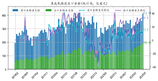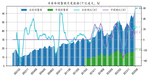 另外,前期我们解读过多次,半导体行业正处于行业周期上行阶段,景气度突出。根据海关数据,9月当月集成电路出口金额190.47亿美元(历史新高),同比增长32.80%,环比+7.47%;出口数量323亿块,同比+17.0%。另一方面,据SIA数据,8月全球半导体行业销售额为648.8亿美元(历史新高),同比+21.7%,环比+4.4%;中国为176.3亿(历史新高),同比+12.4%,环比+3.3%。