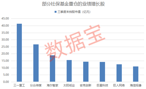 业绩增长股亦备受机构资金青睐,上述归母净利润同比增长的57股中,有18股三季度末获得社保基金重仓,合计持股市值达到192.52亿元,其中三一重工、分众传媒、海尔智家的社保基金持股市值居前,分别达到41.42亿元、26.81亿元、18.96亿元。
