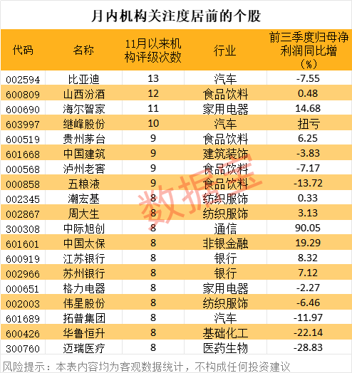 分个股来看,11月以来共有91股获得5家及以上机构评级,其中比亚迪、山西汾酒、海尔智家、继峰股份评级家数居前,分别为13家、12家、11家、10家。