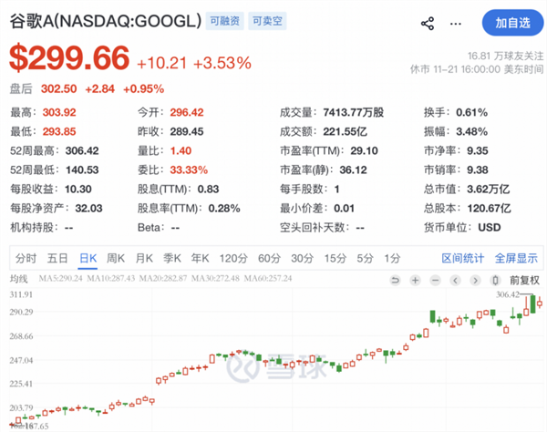 受最新发布的AI模型Gemini 3刺激,谷歌股价大幅飙涨,截至美东时间周五收盘,涨幅达3.53%,本周累计涨幅超8%,总市值升至3.62万亿美元,超越微软,跻身美股市值榜第三位。