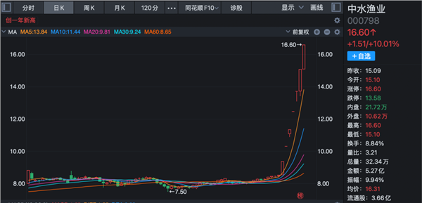 水产养殖板块持续走高,中水渔业(000798)走出7连板涨停,开创国际涨停。