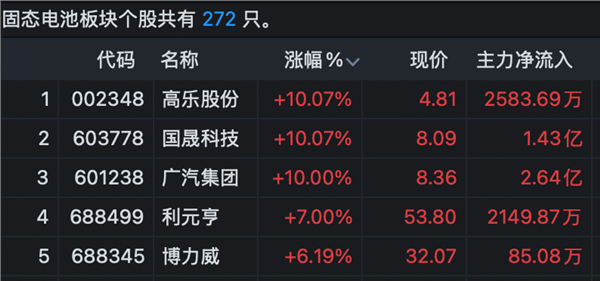盘初,固态电池板块持续活跃,高乐股份、国晟科技、广汽集团涨停,孚能科技、利元亨、英力股份、宏工科技等跟涨。