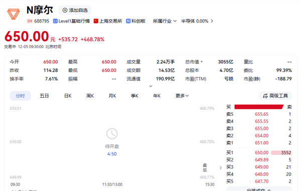 “国产GPU第一股”摩尔线程今日登陆科创板。摩尔线程开盘大涨468.78%,最新股价报650元/股,若据此计算,中一签新股可赚约26.79万元。
