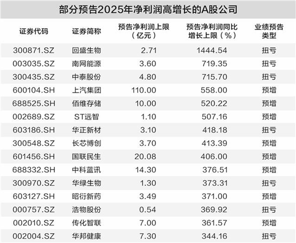 目前预计净利润增幅最高的是回盛生物。该公司主要从事兽用药品、饲料及添加剂研发、产销。1月9日,公司披露业绩预告,预计2025年归母净利润2.35亿元至2.71亿元,同比增长1265.93%至1444.54%。