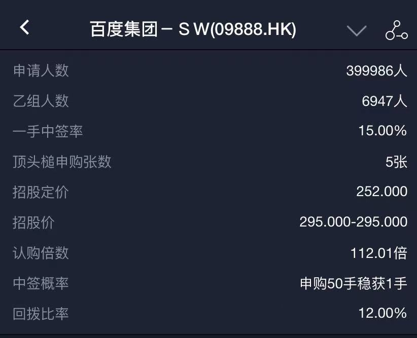 其中,百度香港发售股份1140万股,获112.01倍认购,合共接到约40万份有效申请,但近20万人仅认购一手。一手中签率15%,认购50手稳中一手。百度国际发售也获超额认购,发售股份最终数目为8360万股,约相当于发售股份总数的88%。