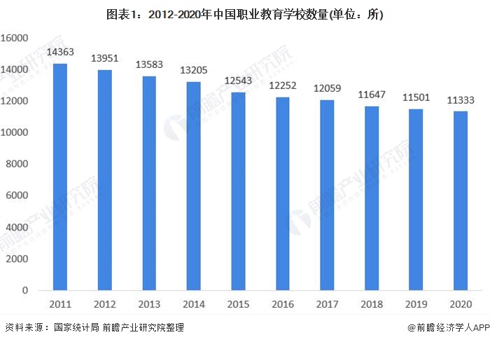 从学校数量来看,我国职业学校数量近年来连续下降。根据国家统计局数据显示,截至2020年底,我国职业学校数量为11333所,较2019年减少168所。