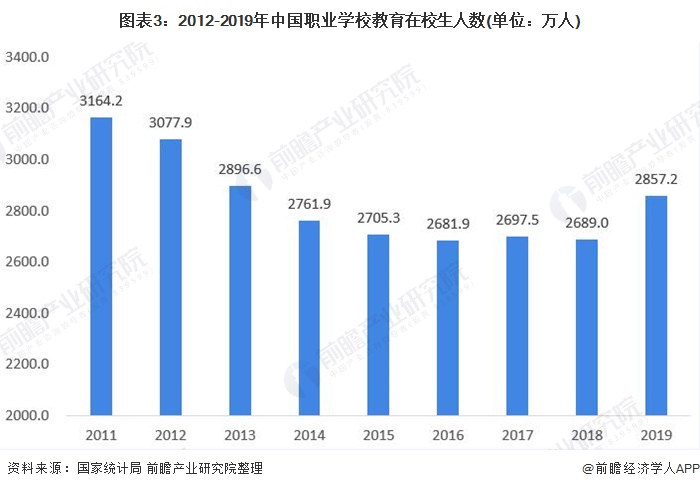 从在校学生情况来看,我国职业学校教育在校生人数近年来波动下降。根据国家统计局数据显示,截至2019年底,我国职业教育在校生人数为2857.2万人,比2018年增加168.2万人。