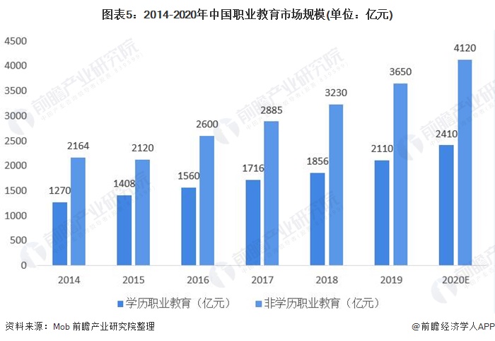 职业技能人才的紧缺将进一步推动我国职业教育行业快速发展。根据Mob研究院数据显示,2014-2019年我国职业教育市场规模总体呈逐年增长态势,年均复合增速为11%。其中2019年我国学历职业教育规模达到2110亿元,较2018年增长13.69%。2020年学历职业教育规模将达到2410亿元。