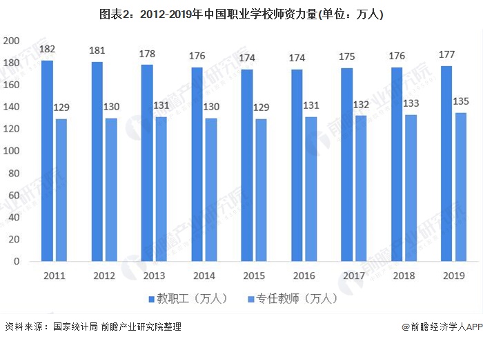 从师资力量来看,我国职业学校师资力量近年来波动变化。根据国家统计局数据显示,截至2019年底,我国职业学校教职工为177万人,比2018年增加1万人;专任教师为135万人,比2018年增加2万人。
