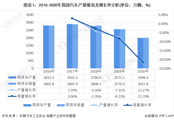 根据中国汽车工业协会数据显示,自2017年起我国汽车产销量处于逐年下降趋势。2020年我国汽车行业产量为1999.4万辆,较2019年下降22.27%;2020年我国汽车销量为2017.8万辆,较2019年下降21.70%,为近五年来汽车产销量降幅最大的一年,主要原因在于2020年新年伊始新冠疫情使得汽车行业失去了年初“开门红”的优势,外加新冠疫情导致经济下行人们消费信心下降导致汽车行业在2020年产销下降明显。