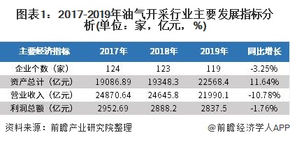 根据国家统计局统计的数据,2019年石油和天然气开采业规模以上企业数量有119家,较上年的123家有所下降;行业资产总额达22568.4亿元,同比增长11.64%;行业营业收入21990.1亿元,同比下降10.78%;利润总额2837.5亿元,同比下降1.76%。