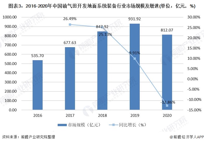 以中石油的数据为参考,油气开发地面系统装备占石油勘探和开采板块成本的35%,前瞻根据对“三桶油”和杰瑞股份分部的财务数据进行整理,来对我国油气田开发地面系统装备行业市场规模进行测算,2016-2019年我国油气田开发地面系统装备行业市场规模逐年增加,但增速逐年下降,2019年市场规模达到最高931.92亿元,2020年,受疫情影响,我国油气田开发地面系统装备行业市场规模同比下降12.86%至812.07亿元。