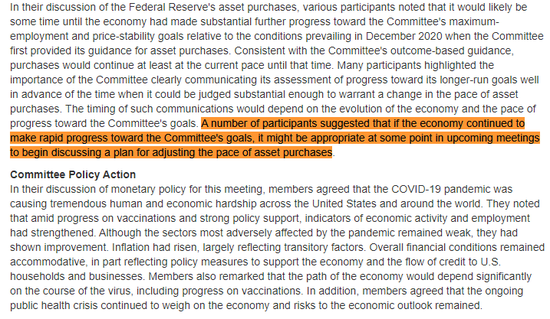 美联储周四凌晨公布4月货币政策会议纪要,美联储官员暗示未来会讨论减码,经济活动的强劲回升将引发收紧政策的讨论。部分官员预计,美联储即将在未来几次会议上开始讨论减码QE。