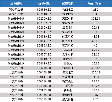 截至2021年4月1日,国内共有有机硅相关注册企业约为4040家,沪深交易所上市公司共21家,新三板挂牌公司共11家,其中合盛硅业市值最大,达413.47亿元。