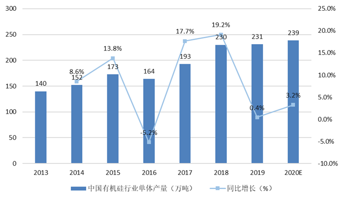 【前言】2013-2019年中国有机硅单体产量呈现波动上升趋势, 根据百川盈孚统计数据,2019年中国有机硅单体产量达到231万吨。随着有机硅单体产能的陆续投产,预计2020年中国有机硅单体产量将达239万吨,同比增长3.2%。