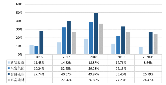 图表7:2016-2020年代表性上市公司有机硅业务毛利率情况(单位:%)