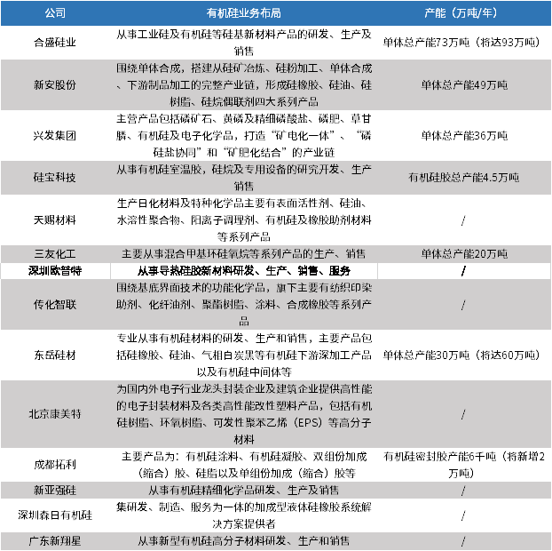 目前我国许多企业在有机硅领域有所布局,合盛硅业主要从事工业硅及有机硅等硅基新材料产品的研发、生产及销售, 2020年其有机硅单体产能为73万吨/年,2021年新产能投产后预计将达93万吨/年。