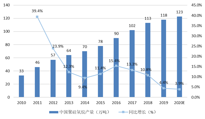 图表2:2010-2020年中国聚硅氧烷产量走势图(单位:万吨,%)