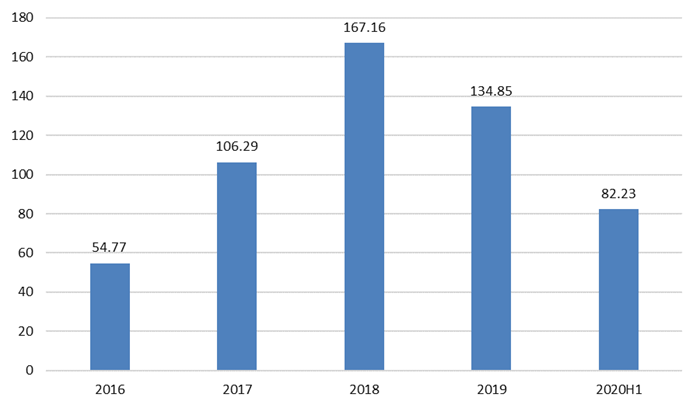 2016-2018年,浙江新安化工集团股份有限公司、湖北兴发化工集团股份有限公司、合盛硅业股份有限公司以及山东东岳有机硅材料股份有限公司有机硅业务营业收入总和逐年增长, 2019年四家代表性公司有机硅业务营业收入总和有所下降,为134.85亿元。2020H1四家代表性公司有机硅业务营业收入总和为82.23亿元。