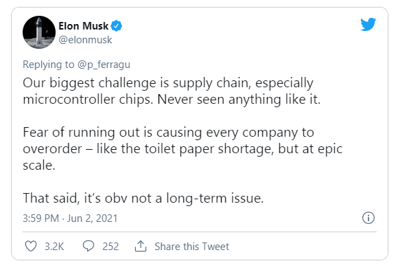 马斯克周三在社交媒体上表示,公司最大的挑战是供应链,尤其是微控制器芯片。目前所有公司都超量订购,就像卫生纸短缺一样,只是规模巨大。