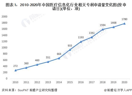 专利数量可以反映出行业技术的活跃度情况,专利数量越多,代表技术研发的活跃度越高。在SooPAT专利信息服务平台上以“医疗信息化”为关键词进行检索,截至2021年4月28日,有关专利共有1.2万项。按申请年进行分析,2010-2020年,我国医疗信息化行业相关专利申请量逐年上升,尤其是2015年之后有明显增加。我国医疗信息化领域的研发活动十分活跃。