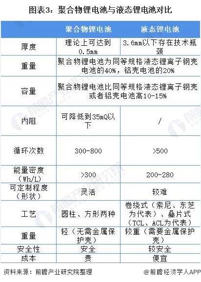 聚合物锂电池的厚度理论上可达到0.5mm,符合手机对电池厚度在4mm及以下的要求;聚合物锂电池与液态锂电池相比,在同等容量下重量更轻,在同等尺寸下容量更高;聚合物电芯的内阻可达35mΩ以下,极大地减低了电池的自耗电。