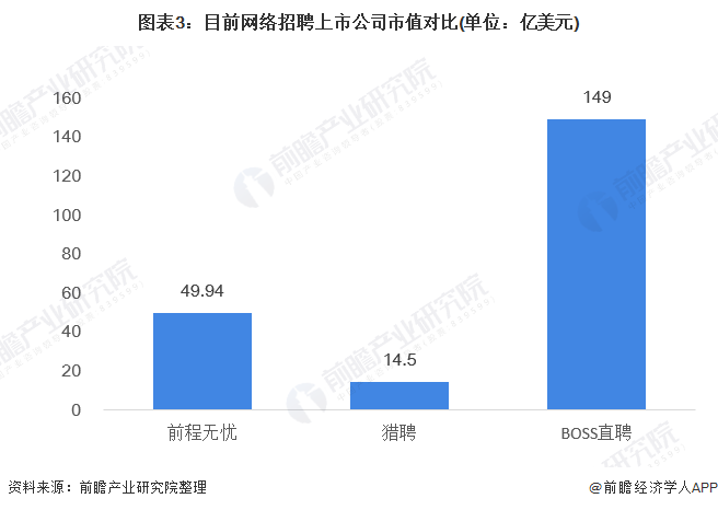 但是随着美东时间6月11日BOSS直聘的上市2021年我国上市网络招聘行业的格局将有所改变。截至美东时间6月11日收盘,前程无忧总市值49.94亿美元,猎聘总市值112.46亿港元,约14.5亿美元,BOSS直聘收盘市值以149亿美元超过前程无忧和猎聘市值之和。