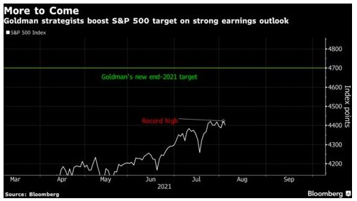 高盛策略师上调了其对标普500指数的预期,因为强劲的盈利增长和低利率助长了人们对股市在创纪录高位的情况下仍能继续上涨的乐观情绪。根据该行的一份报告显示,David J. Kostin及其同事将标普500指数在2021年底的目标点位提高至4700点,大约在一个月前,该指数突破了其此前预期的4300点。这意味着,在今年剩余时间内,该指数较当前水平还有7%的上涨空间。