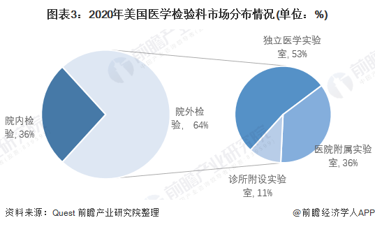 根据Quest年报披露的数据,2020年美国医学检验市场中院外检验为主要检测机构,占比高达64%;其中独立医学实验室占比53%,医院附属实验室占比为36%,诊所附设实验室占比11%。