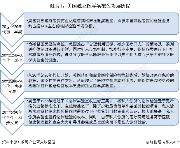 美国临床检验实验室商业化运营兴起较早。在1925年,美国就已经有医院商业化运营其临床检验实验室,承接来自其他医院的检验业务。在20世纪60年代末,依托于逐渐成熟的检验技术和实验室信息系统,一批独立于医院之外的独立实验室开始出现,如LabCorp的前身National Health Laboratories和Quest的前身Met Path。20世纪80-90年代,美国政府和商业医疗保险机构试图控制医疗支出,促使医院将更多的检验项目外包给运营成本更低的独立医学实验室,独立医学实验室行业进入快速发展阶段。1988年,美国通过了《临床实验室改进修正案》,对私人检验诊所进行规范,行业进入稳步发展期。
