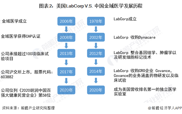 LabCorp起步较早,成立于1978年,通过不断兼并扩张占据市场,2020年成为美国营收排名第一的独立医学实验室。金域医学于2006年成立,于2017年沪交所上市,代码为603882;2020年,公司《2020胡润中国百强大健康民营企业》第58位。