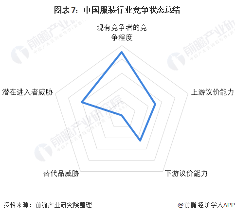 综合分析来看,我国服装行业市场集中度较低,竞争较为激烈;上游供应商议价能力适中;下游客户在低档服饰议价能力较强,高档服饰议价能力较弱;由于服装属于生活必需品,不存在替代品威胁;随着我国服装行业高端化、品牌化的发展,进入门槛将提高。0代表威胁较小,1代表较大,我国服装行业的竞争状态如下:
