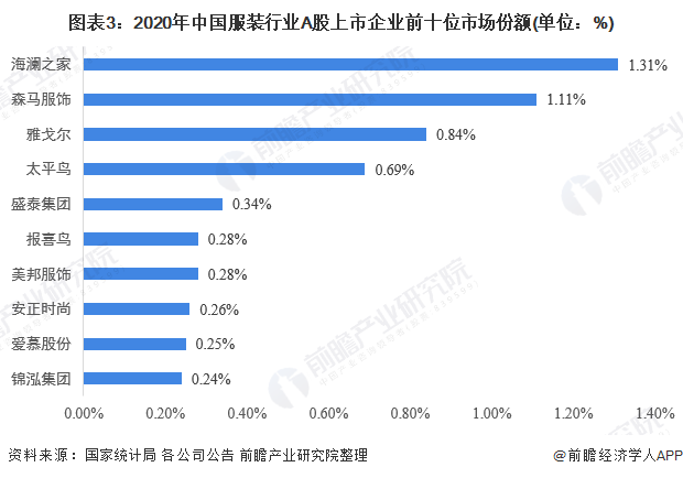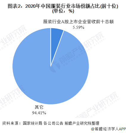根据国家统计局数据显示,2020年中国规模以上服装企业营业收入13697.3亿元。其中以海澜之家、森马服饰、雅戈尔等企业为代表的2020年A股服装上市企业中,排名前十位营收总额占比仅为5.59%